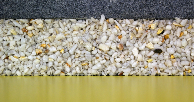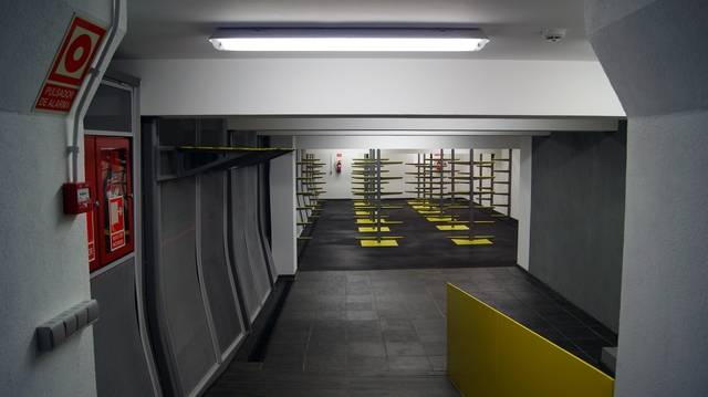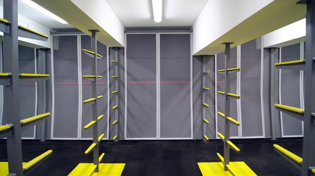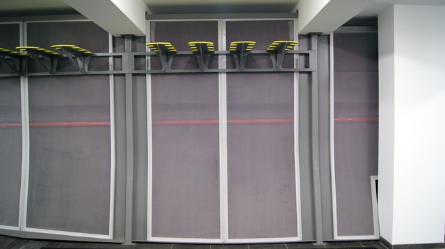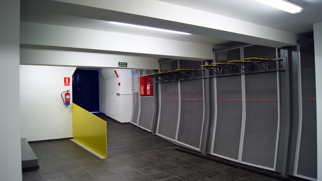 En lo que a la materialización se refiere, la crudeza y rotundidad de los materiales y colores seleccionados para la ejecución se contrapone deliberadamente a la estética de la práctica del deporte al que da servicio.