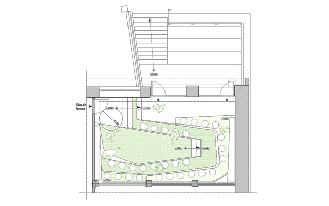 La premisa inicial se basaba en el desarrollo y ejecución de una nueva Sala de Lectura accesible en el interior de un espacio excesivamente rígido, localizado en la Planta Sótano de un pabellón rectangular.